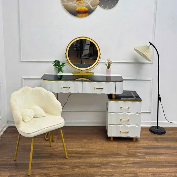 - Mô tả: Bàn trang điểm màu trắng phối vàng được chế tác theo phong cách hiện đại, sang trọng. Mặt bàn phủ kính đen bóng giúp chống trầy và dễ vệ sinh. Hệ thống ngăn kéo rộng rãi đi kèm tủ phụ ba hộc tiện dụng, cho phép lưu trữ mỹ phẩm và phụ kiện ngăn nắp. Ghế ngồi bọc nhung mềm mại, chân sơn vàng đồng bộ, tạo sự hài hòa và đẳng cấp. Đây là lựa chọn lý tưởng cho phòng ngủ hiện đại và tinh tế.
